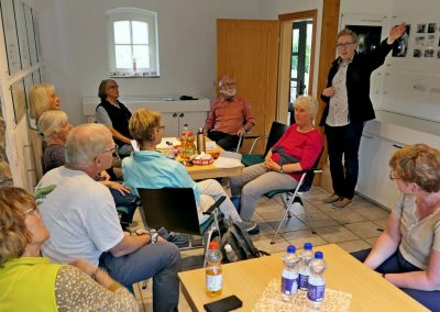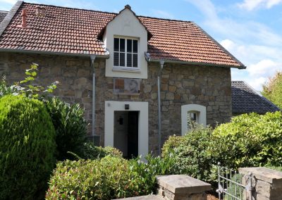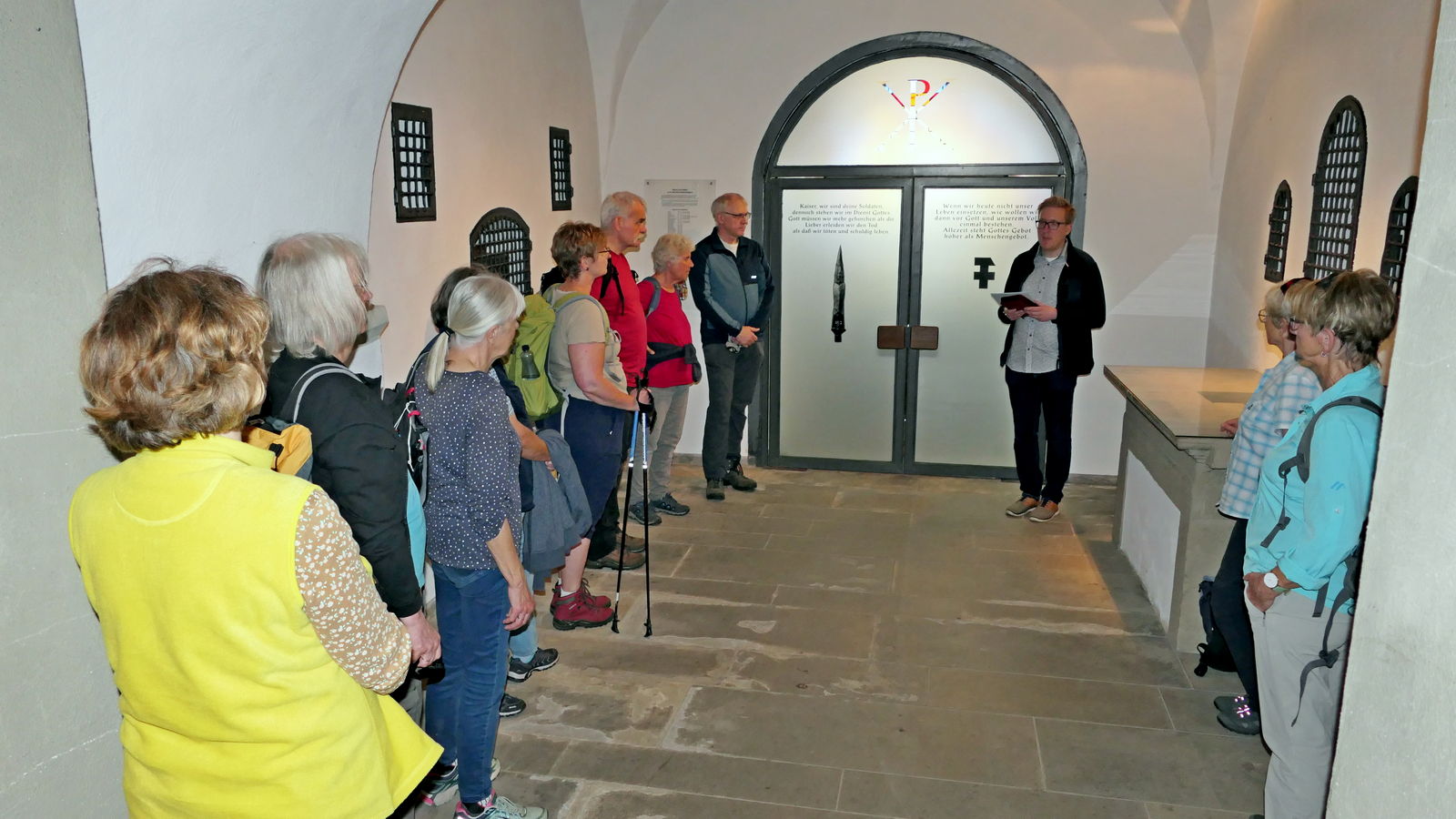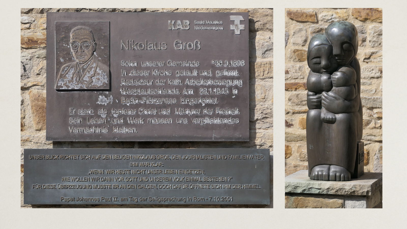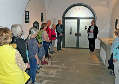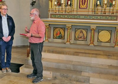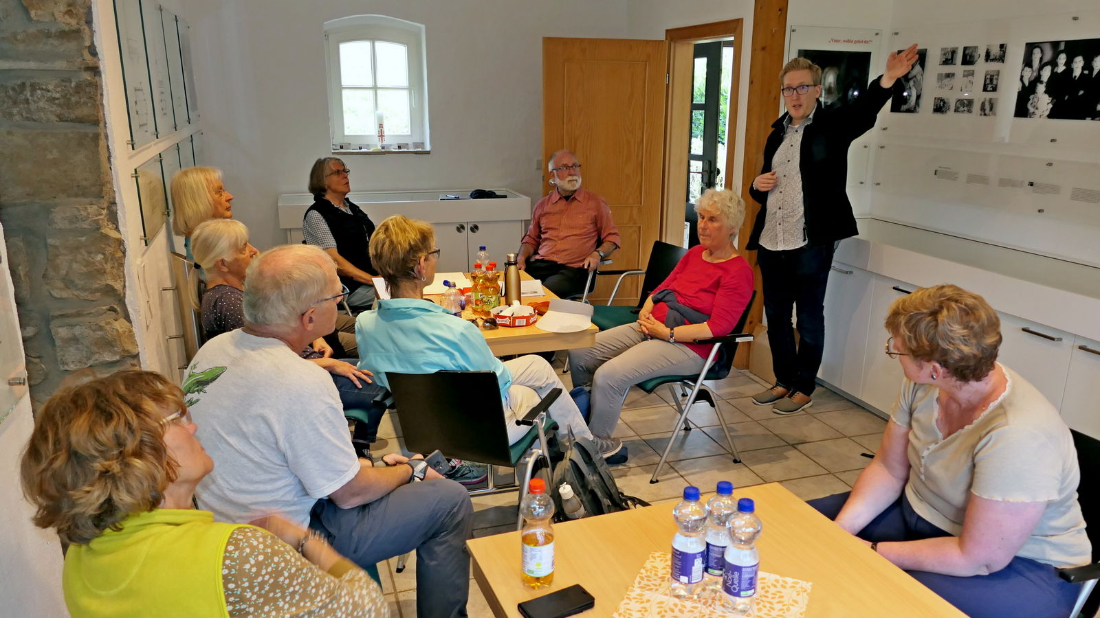 In Niederwenigern wurden wir bereits von Jonas Schulte-Eickholt, der aus Niederwenigern stammt und als Pastoralreferent in der Pfarrei Christus König tätig ist, erwartet und im Nikolaus-Groß-Haus freundlich begrüßt. Dort durften wir bei kühlen Getränken etwas rasten, während Herr Schulte-Eickholt uns die bewegende Geschichte von Nikolaus Groß näherbrachte, dessen Heimat Niederwenigern war. Er wurde 1898 dort geboren und wurde später als christlicher Gewerkschafter, der führend in der katholischen Arbeiterbewegung war, zum Widerstandskämpfer gegen den Nationalsozialismus. Im Zusammenhang mit dem Attentat auf Hitler am 20. Juli 1944 wurde er verhaftet und verurteilt und am 23. Januar 1945 in Berlin-Plötzensee hingerichtet. Die Katholische Kirche hat ihn als Märtyrer selig gesprochen.