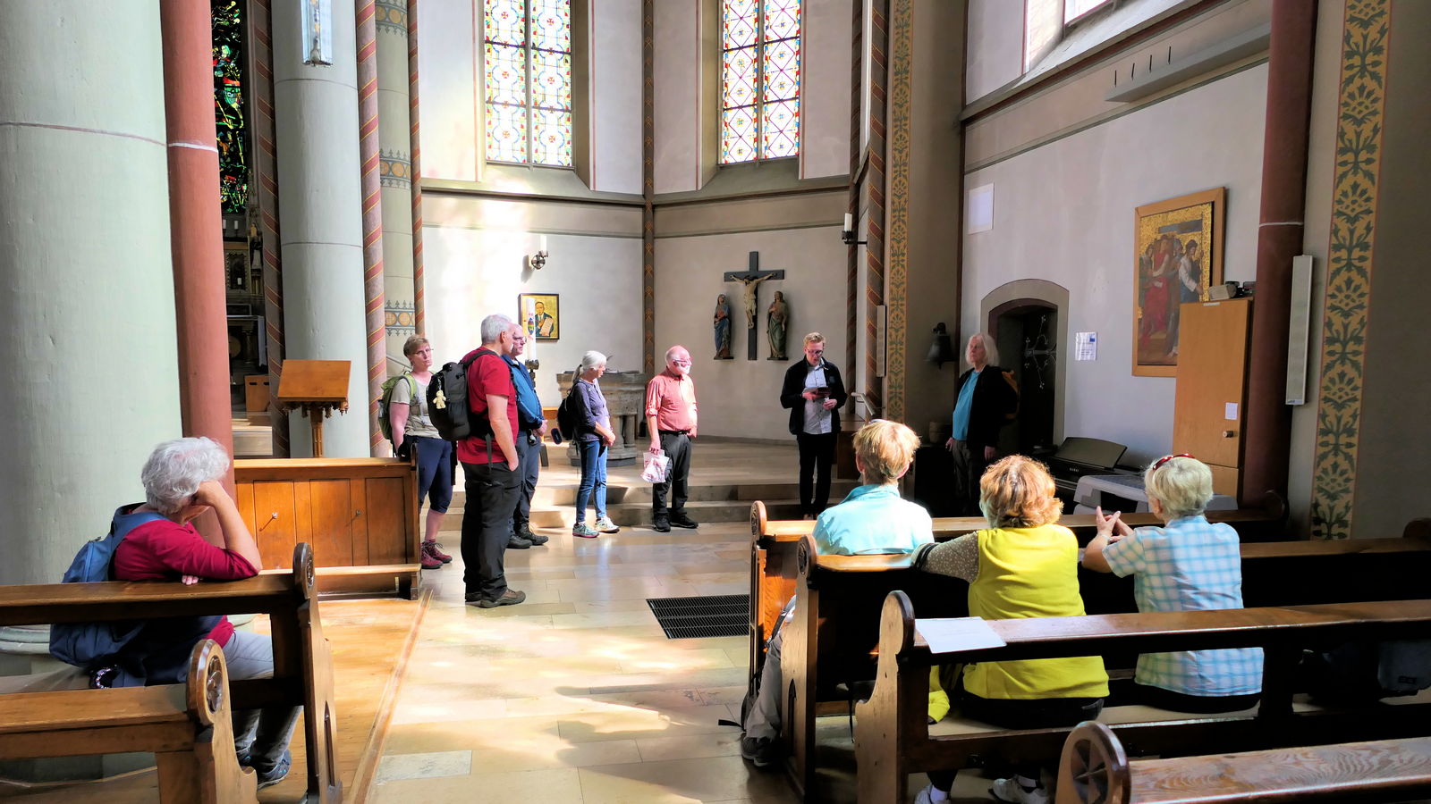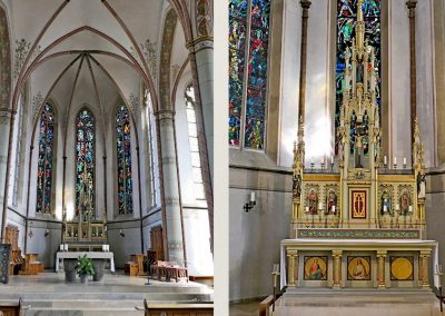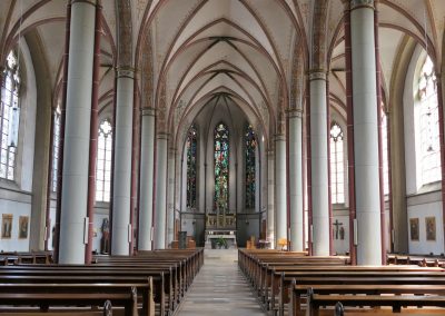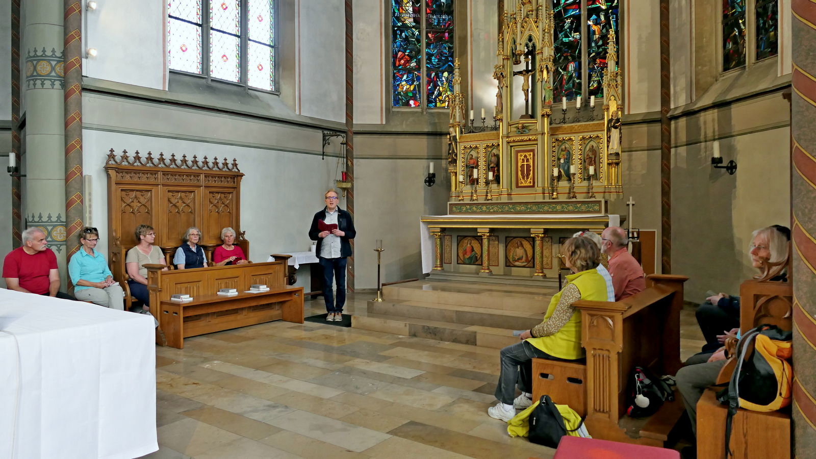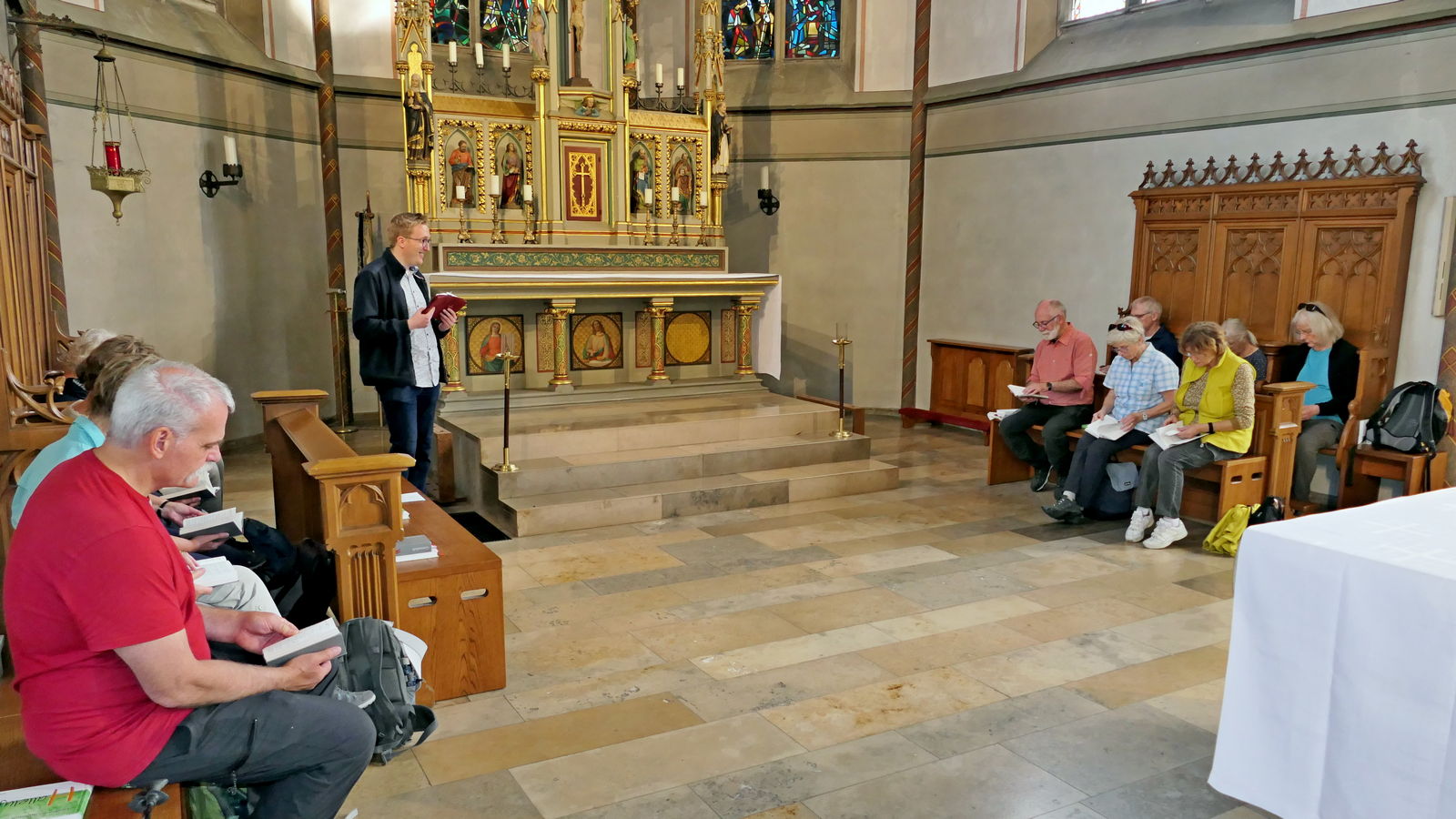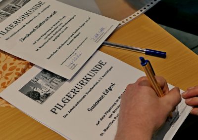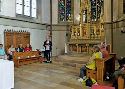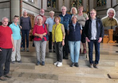 Im Anschluss führte Jonas Schulte-Eickholt die Pilgergruppe durch den beeindruckenden „Dom“ St. Mauritius, der aus einem romanischen Kirchturm und einer riesigen neugotischen Hallenkirche besteht. Die Führung beendete er mit einer Andacht, bei der wir im Chorgestühl Platz nehmen durften. Als Anerkennung und zur Erinnerung erhielt jede Pilgerin und jeder Pilger von Ingo Tacke eine Pilgerurkunde. Danach trafen sich noch alle in fröhlicher Runde in Melanie`s Eisdiele. Am Ende brachten die beiden Bullis alle wieder sicher zurück nach Breckerfeld. Es war ein sehr schöner Tag.